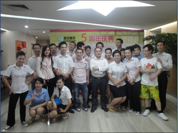 2012年9月29日晚上20時,嘉杰人匯聚在酒店,人頭攢動,現場被熱烈的氣氛籠罩著,嘉杰公司建廠五周年慶典晚會在這里舉行。音樂聲慢慢響起,燈光照亮了兩位年輕主持人燦爛的笑容。宴會廳幕布上寫有“熱烈慶祝深圳嘉杰橡塑有限公司成立五周年”字樣的紅色大字引人注目。