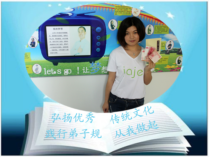 今天早會上,公司一位嘉人將《弟子規》全部背出,獲得了五百元的獎金,更獲得了大家的贊賞,成為我們公司中第一個可以把弟子規背下來的同事。我相信接下來將會有更多的同事背誦出《弟子規》,領悟其中真諦,一起締造中國最具幸福感的公司!
